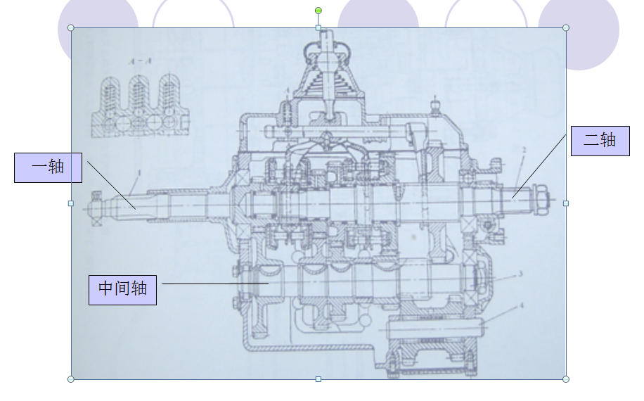 三轴变速器由输入一轴、中间轴和输出二轴组成,输出一轴和输出二轴同心,与中间轴平行,输入一轴与中间轴有一组常啮合尺寸。相比于二轴变速器,三轴变速器由于每个档位传动均有两队齿轮完成,顾传动效率要低,直接档则不通过中间轴直接输出到输出轴,并且在齿轮中心距较小的前提下依然可以获得很大的传动比。