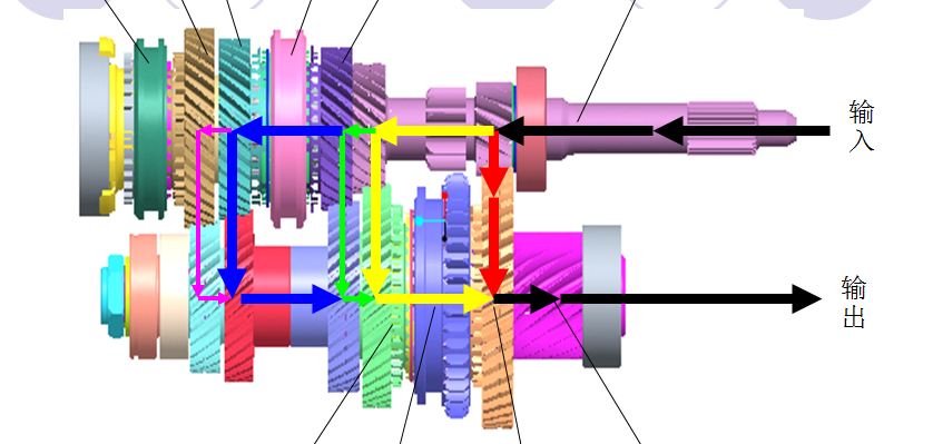 下面是个简单的二轴式变速器的功率流: